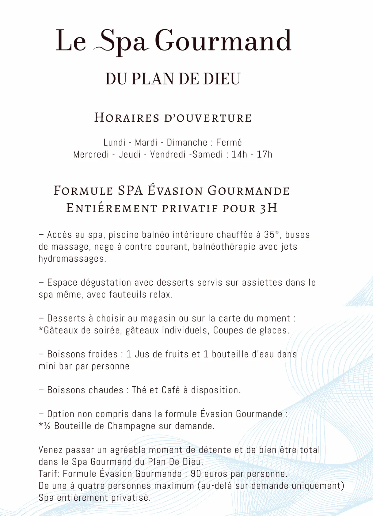 En 2024, Myriam et Stéphane vous proposent de lier l'excellence gourmande avec les bienfaits d'un spa situé à la pâtisserie même. Le temps d'un après midi de détente entièrement privatisé venez découvrir l'alliance d'une dégustation sucrée et une relaxation au spa équipé d'une piscine intérieure balnéo chauffée à 35° avec des buses de massage, nage à contre courant et balnéothérapie avec un mélange de jets d'eau et d'air pulsé qui viennent vous caresser la peau. Ces bains chauds trouvent leurs racines dans les Thermes de la Grèce et de la Rome antique ou les bienfaits de l'eau chaude étaient déjà reconnus et célébrés sous le nom de bains purificateurs. D'ou le nom de SPA : Sanitas Per Aqua : Santé par l'eau.